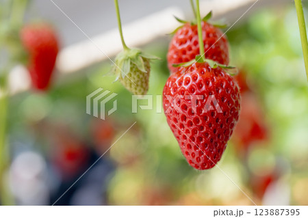 日本溫室草莓種植。採摘草莓體驗。 草莓掛在樹上