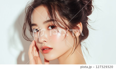 Beautiful Korean woman showcasing elegant makeup and hairstyle with soft lighting in a minimalistic setting