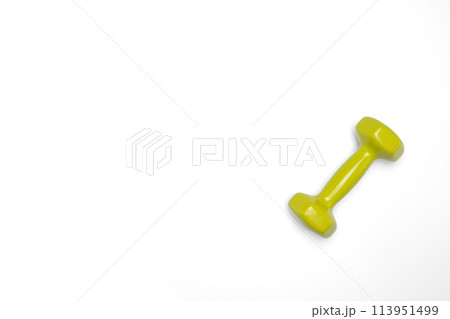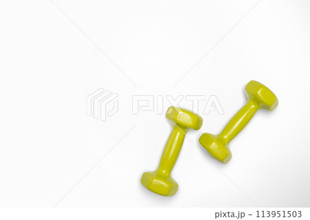 Colorful elastic bands for fitness classes and dumbbells on a white background with space for text. Pattern.