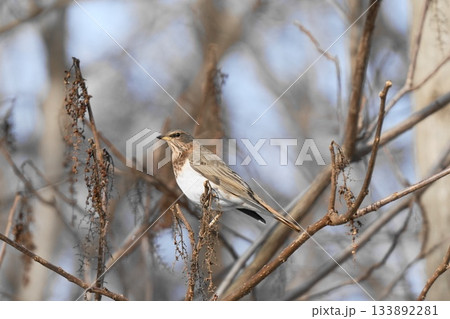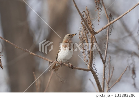 一隻雌性黃眉鹀棲息在樹上