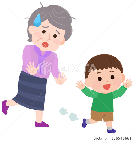 老年婦女與孫輩玩耍後感到疲倦,孫輩們累了,插圖