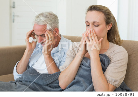 Sick couple sitting on the couch under a blanket