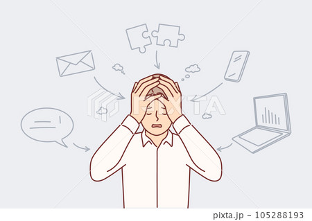 Business man feels headache and puts hands on head feeling pressure from overwork and burnout