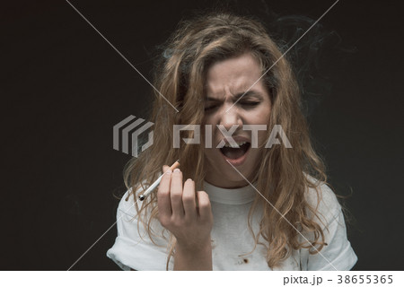 Displeased female person crumpling from smoking
