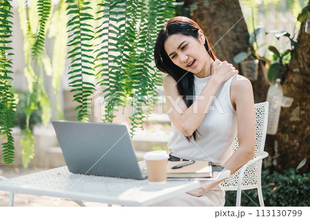 Woman takes a relaxing break from work, enjoying the tranquil environment of an outdoor garden cafe.