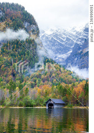 德國國王湖秋色景觀與岸邊靜謐的木屋船塢