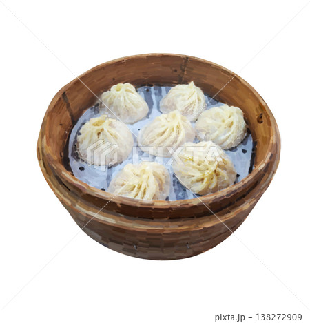 手繪, 小籠湯包, 在, 竹蒸籠裡, 放在, 有花紋的盤子上, 筷子, 醬料碟, 可去背,白色背景