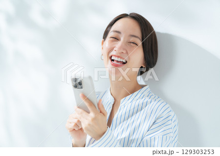 一位年輕女子在陽光普照的藍色背景下操作智能手機