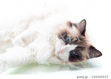 Relaxed snowshoe cat lying isolated on white background and looking to the camera