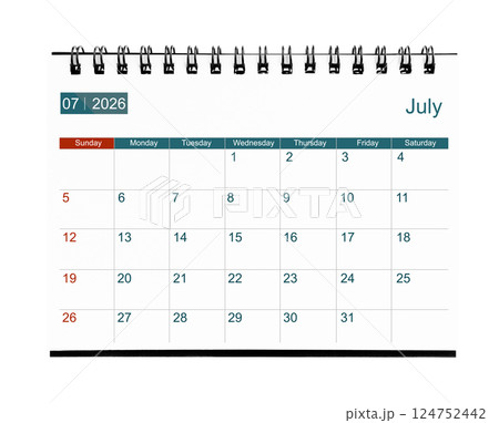 July 2026 calendar. Page of the annual business desk month calendar isolated on white.