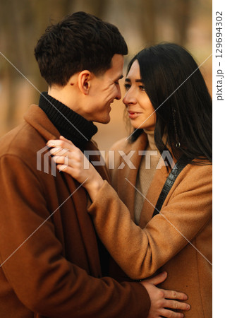 Young couple in love walking in the park on a autumn day. Enjoying time together.