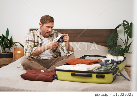 Portrait of handsome man, tourist, looking at his holiday tickets, booked vacation with travel agency, sitting on bed and packing clothes in suitcase
