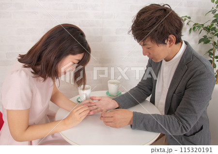 約會時,一對情侶在咖啡店看手相