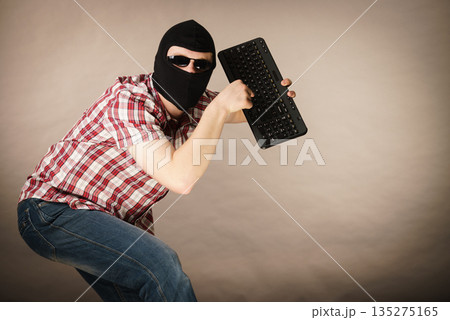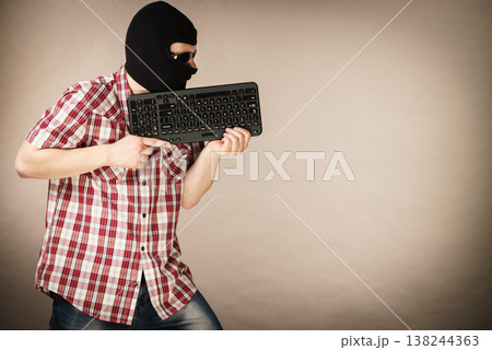 Man wearing balaclava holding keyboard