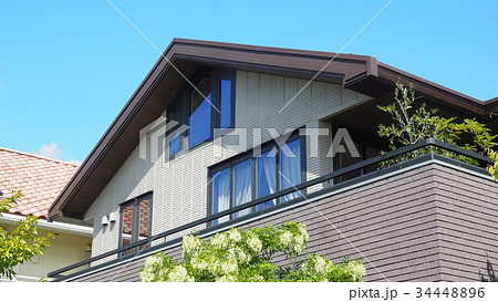 一座漂亮、酷炫、時尚的豪宅,立在角落的立方體形白色外牆上有棕色百葉窗。