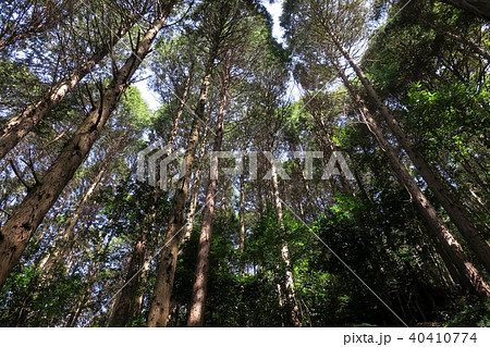 屋久島森林景色:原始森林樹木和腐朽的、空心的倒木