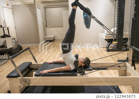 Woman practicing pilates exercise on reformer chair in modern fitness studio