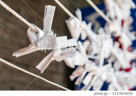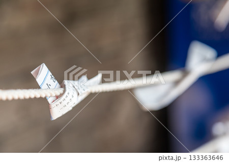 特寫捕捉繫在繩索上乘載願望的傳統白色紙籤