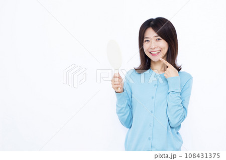 一名 30 多歲的女性指著自己的牙齒