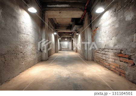 An eerie hallway with brick walls and dim lighting gives the impression of being in an underground passage, or perhaps in a run-down dungeon