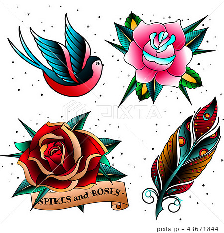 Old School Tattoo Elements and Symbols with Skull and Rose Flower Vector Set