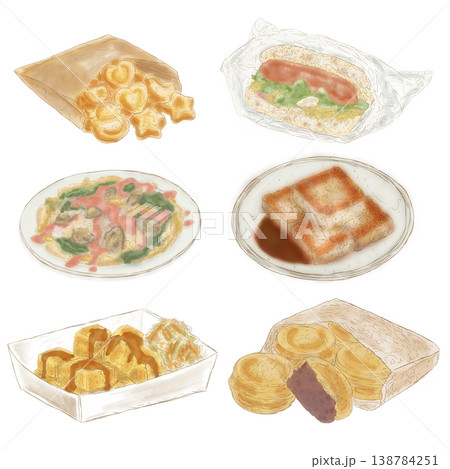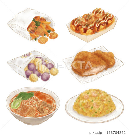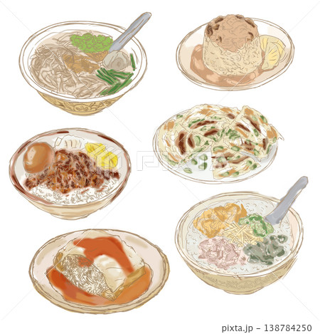 手繪,水彩,線條風,台灣小吃,組合包,鹹酥雞,章魚燒,地瓜球,雞排,牛肉麵,蝦仁蛋炒飯