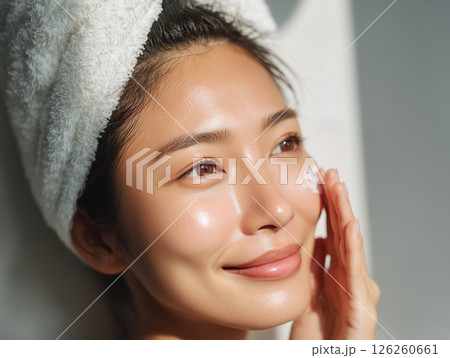 一位女士用毛巾護理皮膚的美麗皮膚圖像