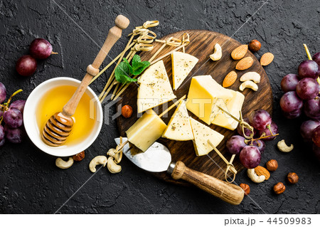 Cheese plate: Parmesan, cheddar, gouda, mozzarella and other with walnuts, cranberries and mint on a