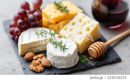 Soft cheese with herbs, Swiss cheese, cheddar cheese, red grapes, nuts, and honey dipper on slate board with glass of red wine, creating cozy gourmet snack setting