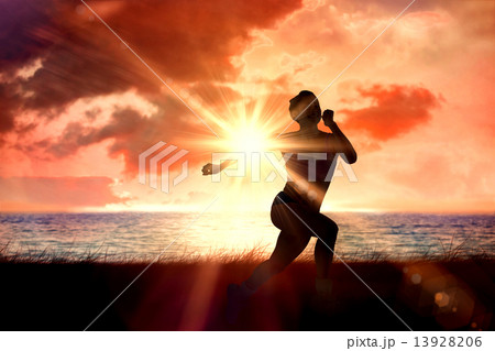 Composite image of fit woman jogging on the beach