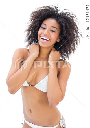 Fit girl in white bikini smiling at camera