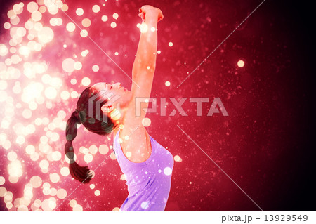 Composite image of fit brunette stretching her arms