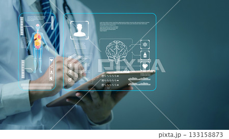 doctor using tablet with digital human anatomy and brain interface, smart healthcare, AI diagnosis, and future medical innovation technology. health check concept.