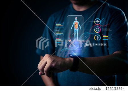 person wearing a smartwatch that tracks health data, with digital holographic visuals displaying vital health statistics like heart rate, temperature, and other health metrics.