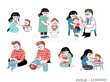 一套嬰兒和育兒用品,一個滑稽的手寫人物,一個矢量,以及簡單的線條圖著色。