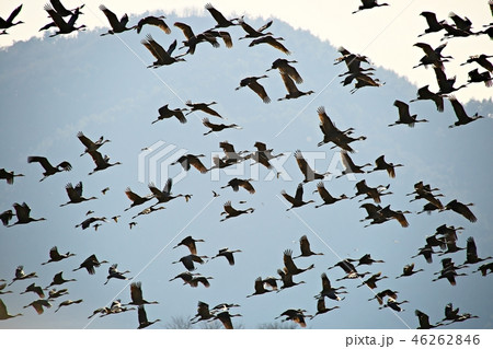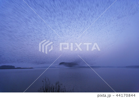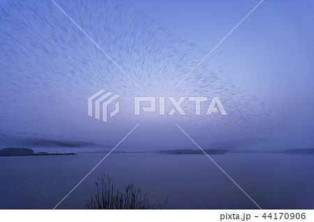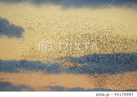 夕陽下夜空飛翔的一群唱鴨群舞