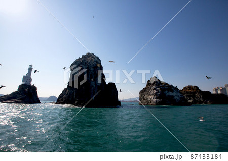 從遊輪上看釜山五六島前海中的海鷗