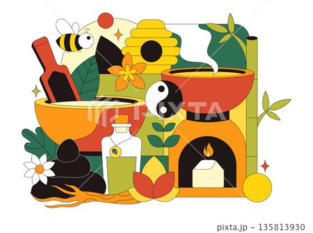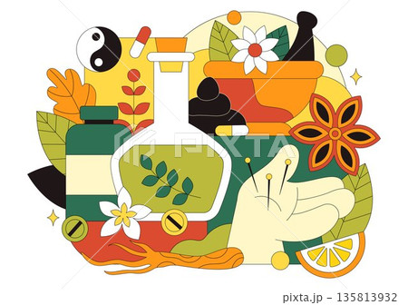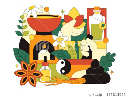 Alternative Medicine And Herbal Healing Vector Illustration With Energy Therapies, Ginseng Root, Essential Oils, Seeds Background