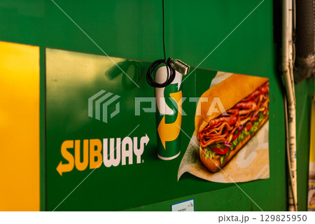 Subway restaurant sign with sandwich and drink images in Seoul, South Korea