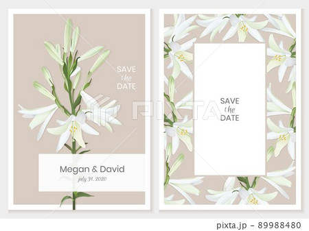 Botanical wedding invitation card, template design with white lilies on a beige background. Stock vector illustration.