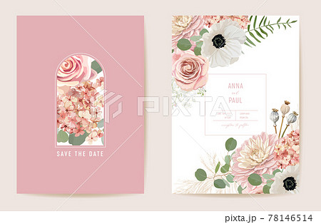 Wedding dried anemone, pampas grass, roses floral Save the Date set. Vector summer dry flowers boho