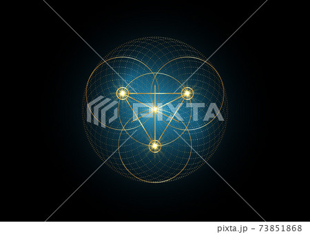 Magic Alchemy symbols, Sacred Geometry. Mandala religion, philosophy, spirituality, occultism concept. Golden triangle with lines and overlapping circles, print vector logo isolated black background