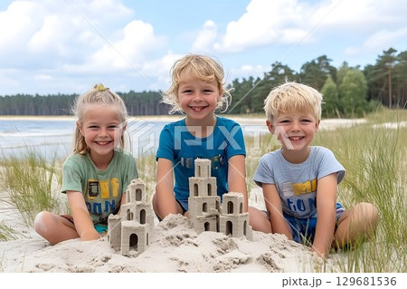 Three Smiling Children Building Sandcastles on a Sunny Beach Day
