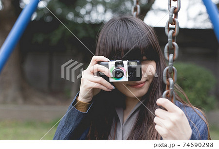 在公園的鞦韆上用即時相機拍照的長發女子的照片
