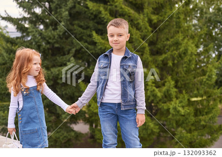 Young caucasian boy and girl holding hands outdoors in denim attire with green