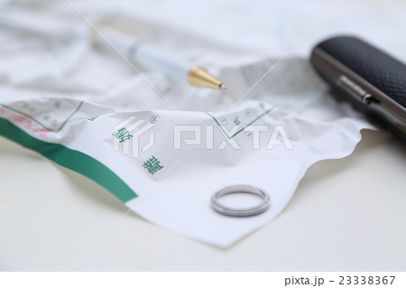 離婚通知(戒指衝擊麻煩告別負面紙質文件悲傷婚姻戒指印章標記郵票標記)