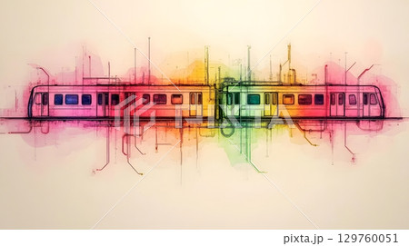 Layered Abstract Scene of Airplane and Train amidst Golden Sky at Transportation Hub