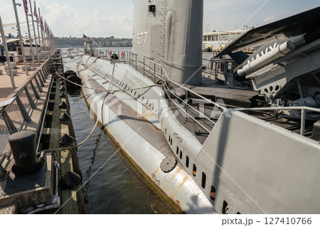 A preserved U.S. Navy submarine is docked at a waterfront museum with visible deck details and mooring ropes. American flags line the pier, and the city skyline can be seen in the background.
