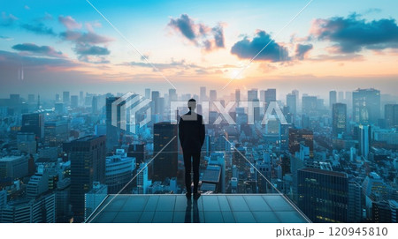 Confident businessman standing on rooftop, overlooking city skyline at sunset, embodying ambition and success