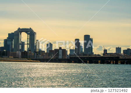 Train across Yodogawa river by umeda sky building at sunset, Osaka